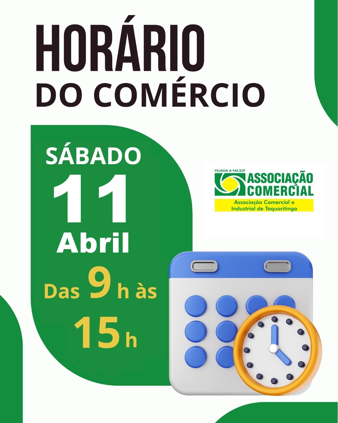 O comércio de Taquaritinga funcionará em horário especial no próximo sábado, 11 de abril, conforme divulgação da Associação Comercial e Industrial de Taquaritinga. De acordo com o comunicado, as lojas estarão abertas das 9h às 15h, ampliando o período de atendimento ao público em relação ao horário tradicional.