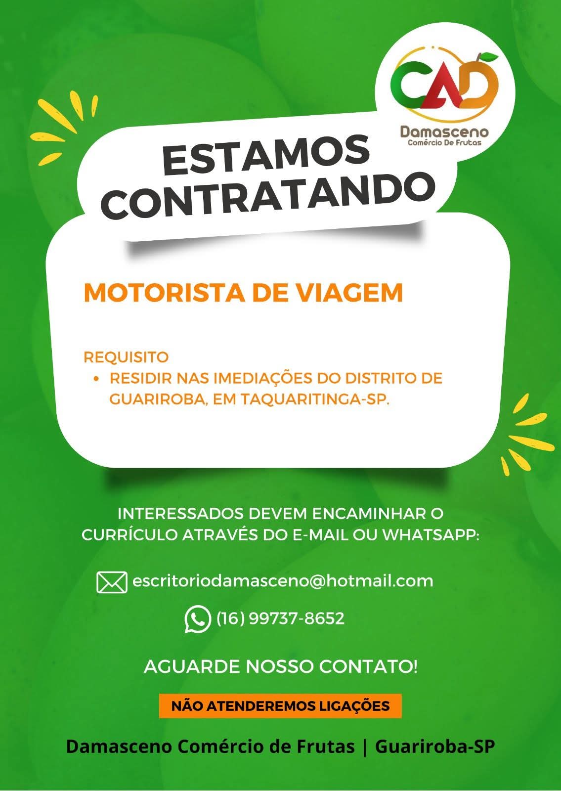 A Damasceno Comércio de Frutas, empresa reconhecida na região de Taquaritinga (SP) pelo trabalho no setor de comercialização e transporte de frutas, anunciou a abertura de vaga para Motorista. A oportunidade é destinada a candidatos que residam nas imediações do distrito de Guariroba.