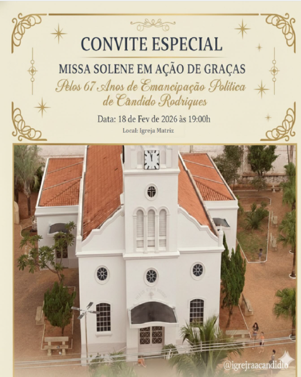 A Prefeitura Municipal de Cândido Rodrigues realizará, no dia 18 de fevereiro de 2026, às 19h, uma Missa Solene em Ação de Graças pelos 67 anos de emancipação política do município. O convite foi direcionado a toda a população e representa o início das atividades comemorativas alusivas ao aniversário da cidade, reafirmando a importância da união comunitária e da preservação das tradições locais.