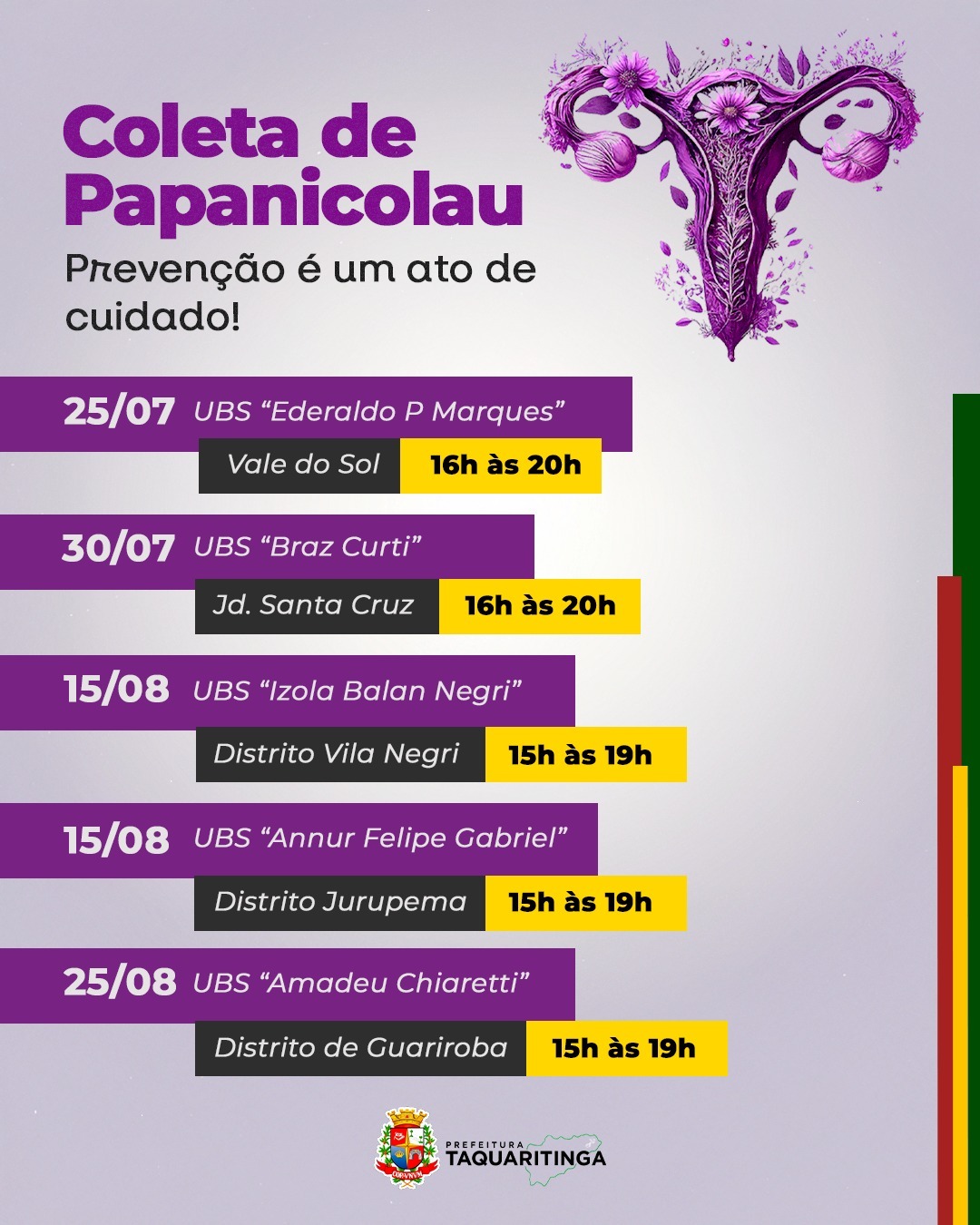 A Prefeitura de Taquaritinga reforça o compromisso com a saúde feminina, e convida todas as mulheres, principalmente entre 25 e 64 anos, a participarem da campanha. É uma ação que valoriza a vida, fortalece o cuidado e promove dignidade.