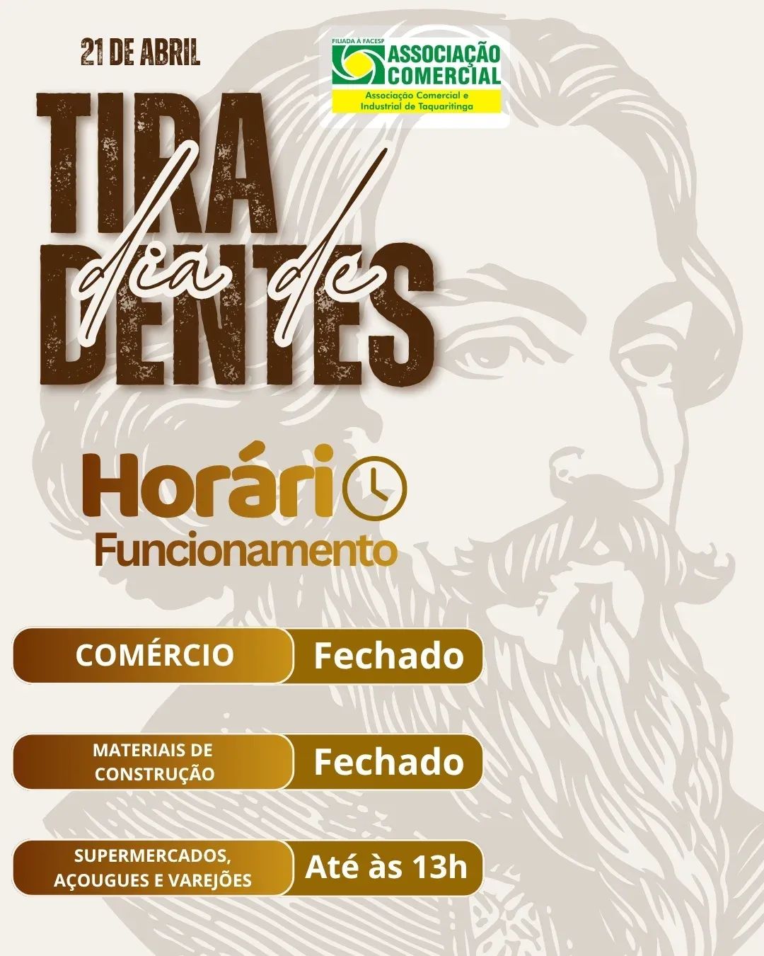 A Associação Comercial e Industrial de Taquaritinga (ACIT) divulgou o esquema de funcionamento do comércio local para o feriado nacional de Tiradentes, celebrado em 21 de abril. De acordo com a orientação repassada à população e ao setor empresarial, haverá alterações no atendimento em diversos segmentos da cidade.