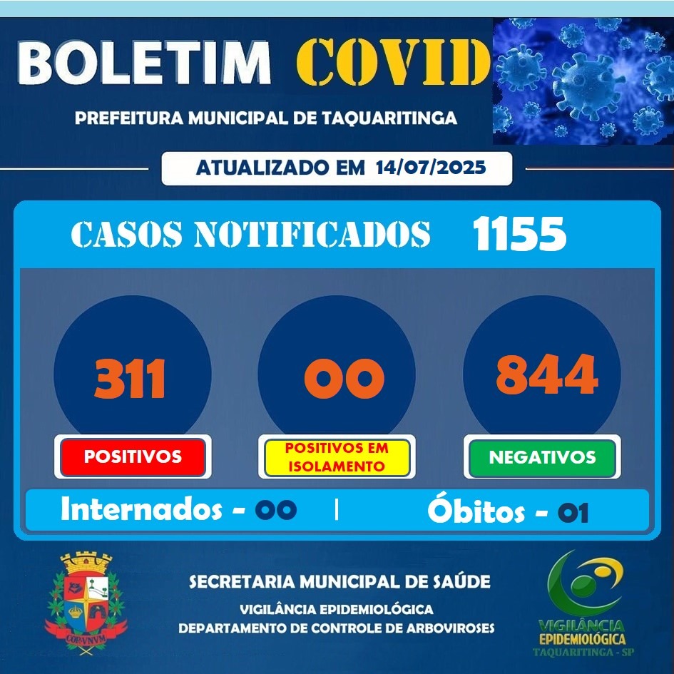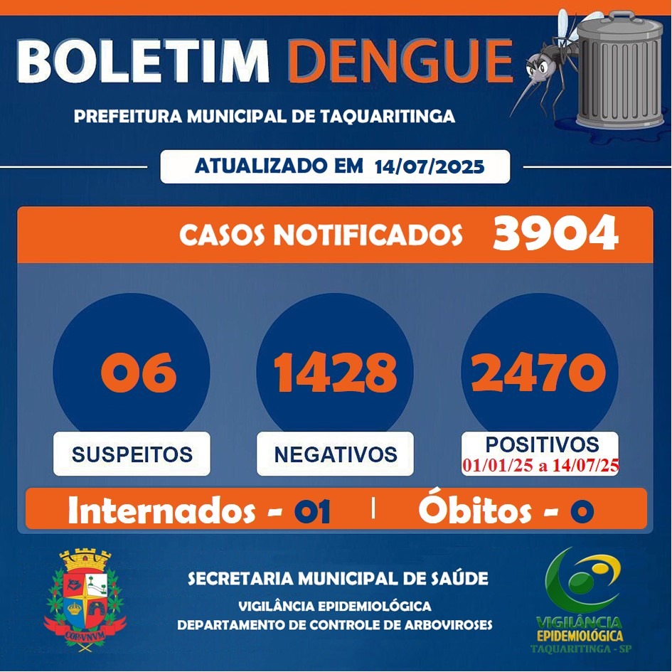A Secretaria Municipal de Saúde de Taquaritinga, por meio da Vigilância Epidemiológica, divulgou nesta segunda-feira (14) o novo boletim atualizado com os dados acumulados de Dengue e Covid-19 em 2025. As informações destacam o cenário da saúde pública local e alertam sobre a necessidade de reforçar as medidas preventivas.