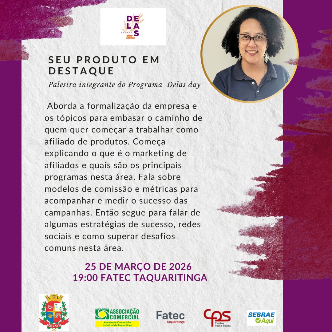 Taquaritinga será palco, nesta quarta-feira (25), de uma iniciativa voltada ao fortalecimento do empreendedorismo feminino. A palestra “Seu Produto em Destaque”, realizada dentro da programação da Semana “Todos por Elas”, acontece às 19h, na Fatec Taquaritinga, reunindo mulheres interessadas em desenvolver habilidades, ampliar conhecimentos e fortalecer sua atuação no mercado.