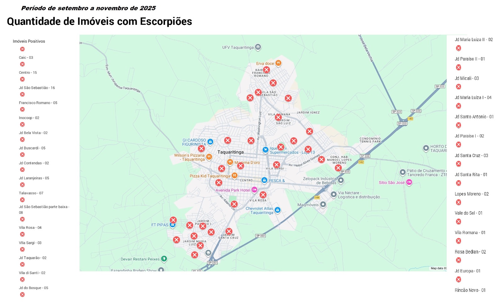 De acordo com os dados apresentados, áreas centrais e periféricas convivem com o problema. O Centro aparece com 15 ocorrências, enquanto Jardim São Sebastião registra 16 e Talavasso, 7. Na região sul da cidade, bairros como Jardim Maria Luiza I e II, Jardim Santa Cruz, Vale do Sol, Jardim São Luiz e Jardim Buscardi também apresentam pontos de infestação, variando entre 1 e 5 imóveis positivos. O mapa mostra ainda registros no Francisco Romano (5), Laranjeiras (5), Jardim do Bosque (5), Rosa Bedran (2) e Lopes Moreno (2), entre outros.