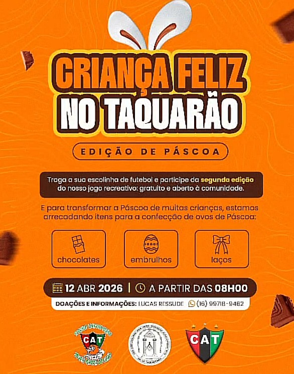 O Clube Atlético Taquaritinga (CAT) anunciou a realização de mais uma edição do evento “Criança Feliz no Taquarão”, programado para o dia 12 de abril de 2026, a partir das 8h, com o objetivo de reunir famílias, incentivar a prática esportiva e promover uma ação solidária voltada à Páscoa. A iniciativa, que já se consolidou no calendário local, é gratuita e aberta a toda a comunidade.