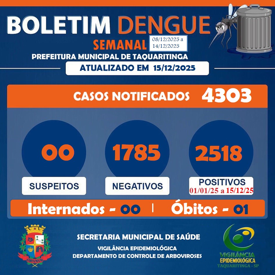 De acordo com os números oficiais, foram 4.303 casos notificados, dos quais 2.518 foram confirmados como positivos para dengue. Outros 1.785 casos tiveram resultado negativo, enquanto não há registros de casos suspeitos em investigação no momento do fechamento do boletim. O relatório também informa que não há pacientes internados atualmente, porém um óbito foi confirmado em decorrência da doença no período analisado.