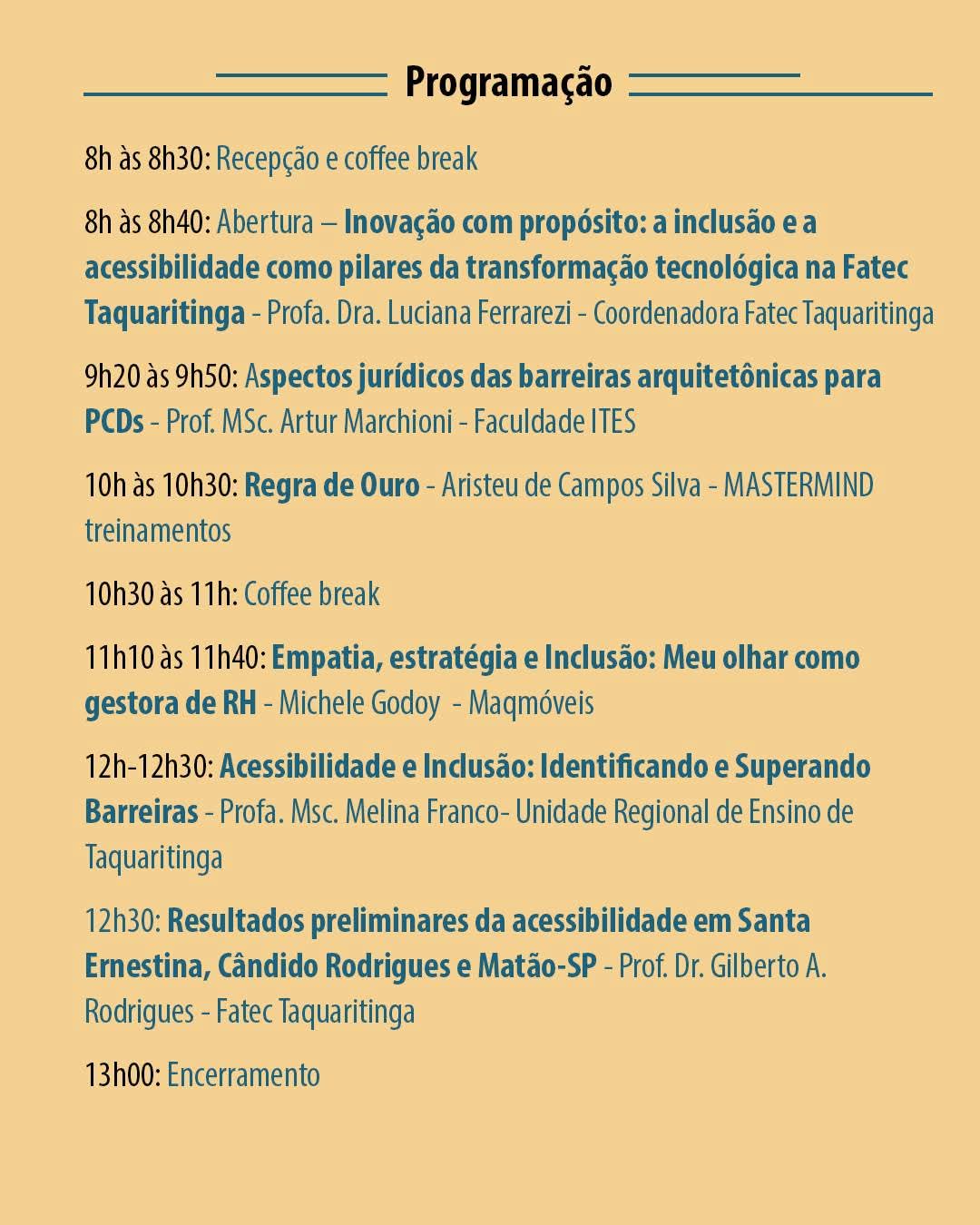 O encontro será aberto às 8h com recepção e coffee break. Em seguida, a coordenadora da Fatec Taquaritinga, Profa. Dra. Luciana Ferrarez, apresentará a palestra “Inovação com propósito: a inclusão e a acessibilidade como pilares da transformação tecnológica na Fatec Taquaritinga”, abordando como a instituição tem trabalhado para integrar práticas inclusivas ao desenvolvimento acadêmico e tecnológico.