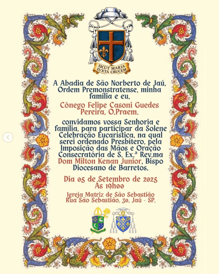 Na noite de 5 de setembro de 2025, a cidade de Jaú (SP) será palco de um momento singular na vida da Igreja. Trata-se da Ordenação Presbiteral do Cônego Felipe Casoni Guedes Pereira, da Ordem Premonstratense, que acontecerá às 19h, na Igreja Matriz de São Sebastião.