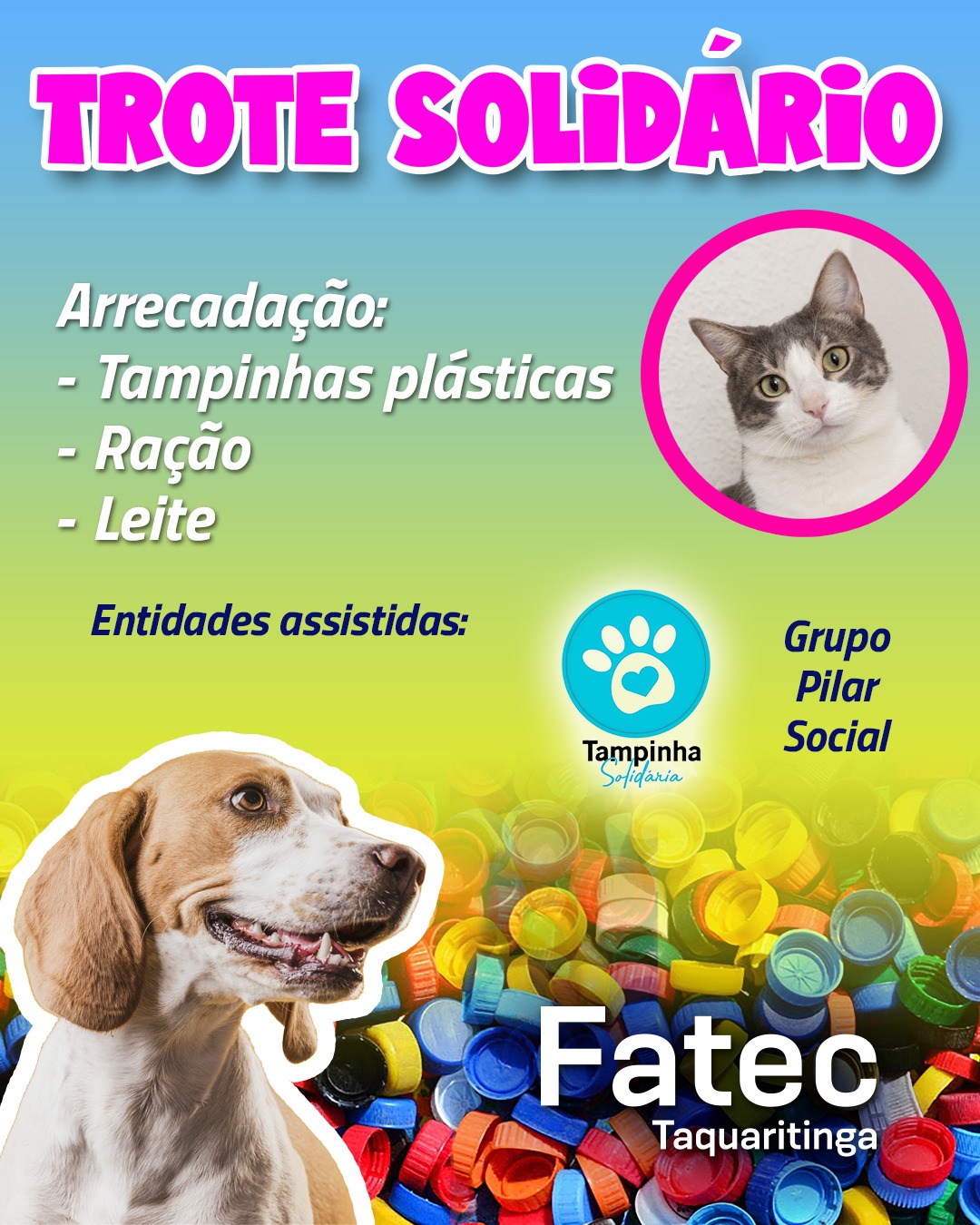 A Fatec Taquaritinga deu início ao seu tradicional Trote Solidário, que neste semestre tem como objetivo arrecadar tampinhas plásticas, ração e leite para beneficiar projetos sociais e comunidades em situação de vulnerabilidade. A ação reforça o compromisso da instituição com a responsabilidade social, envolvendo alunos e colaboradores em uma iniciativa que vai além do ambiente acadêmico.