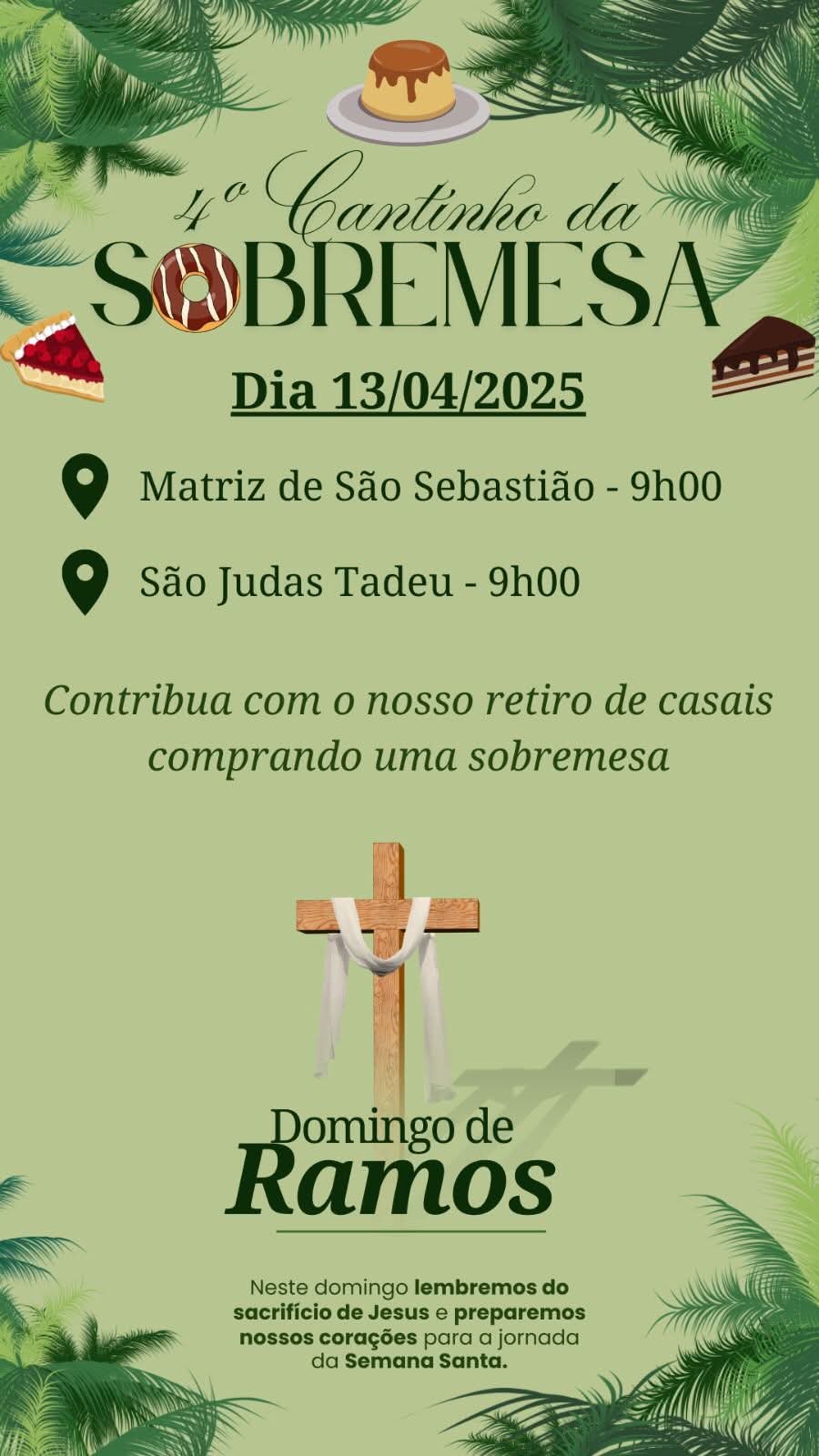 No próximo domingo, 13 de abril de 2025, será promovida a 4ª edição do evento “Cantinho da Sobremesa” em Taquaritinga. A iniciativa acontecerá em dois locais: na Matriz de São Sebastião e na Comunidade São Judas Tadeu, ambas com início previsto para as 9h. A proposta será voltada à arrecadação de fundos para a realização do retiro de casais da paróquia local.