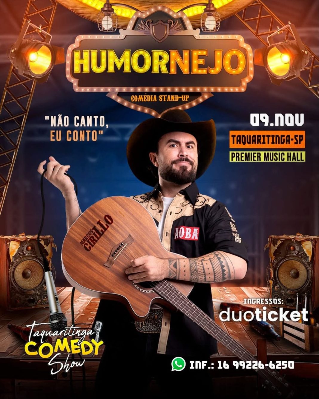 Taquaritinga se prepara para receber uma das apresentações mais aguardadas do ano. O humorista Marcus Cirillo chega à cidade no próximo domingo, 9 de novembro, com o espetáculo “Humornejo”, uma mistura irreverente de stand-up comedy e cultura sertaneja, que promete arrancar gargalhadas do público. O evento será realizado no Premier Music Hall, e os ingressos já estão disponíveis no site Duoticket.com.br.