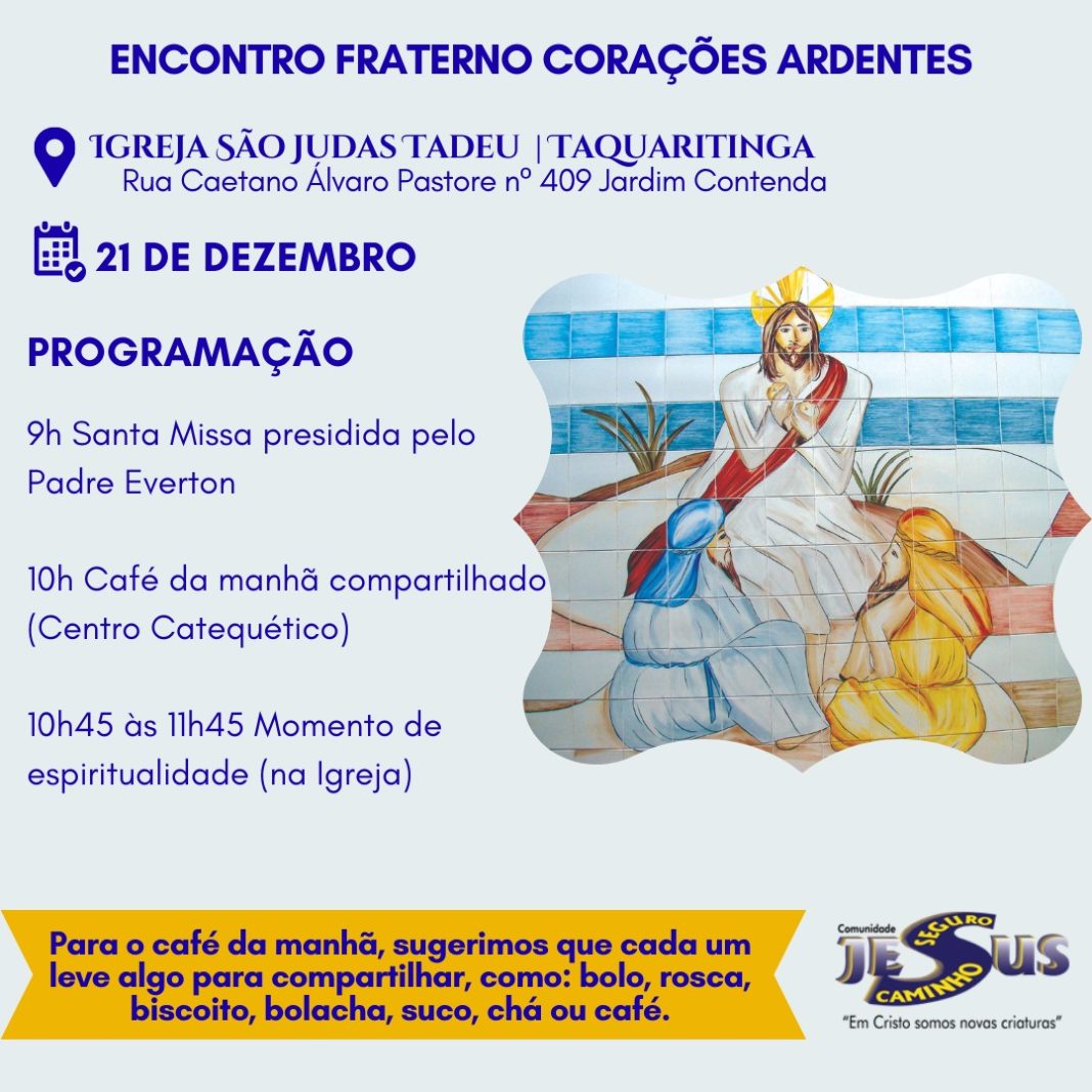 Na sequência, das 10h45 às 11h45, será realizado um momento de espiritualidade, novamente na igreja, com reflexões e dinâmicas voltadas ao aprofundamento da fé e à vivência comunitária. O Encontro Fraterno Corações Ardentes é promovido pela Comunidade Jesus Caminho Seguro, que atua em Taquaritinga com ações voltadas à evangelização e ao acolhimento, sob o lema “Em Cristo somos novas criaturas”.