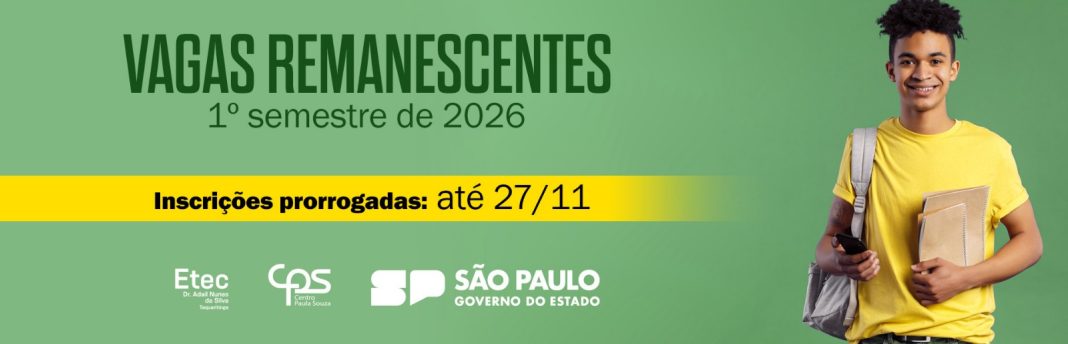 A Escola Técnica Estadual Dr. Adail Nunes da Silva (Etec DANS) prorrogou até o dia 27 de novembro o período de inscrições para o processo de seleção de vagas remanescentes dos cursos técnicos e do Ensino Médio Integrado para o 1º semestre de 2026. A medida amplia as chances de estudantes e profissionais interessados em ingressar na instituição, que integra o Centro Paula Souza, órgão vinculado ao Governo do Estado de São Paulo.