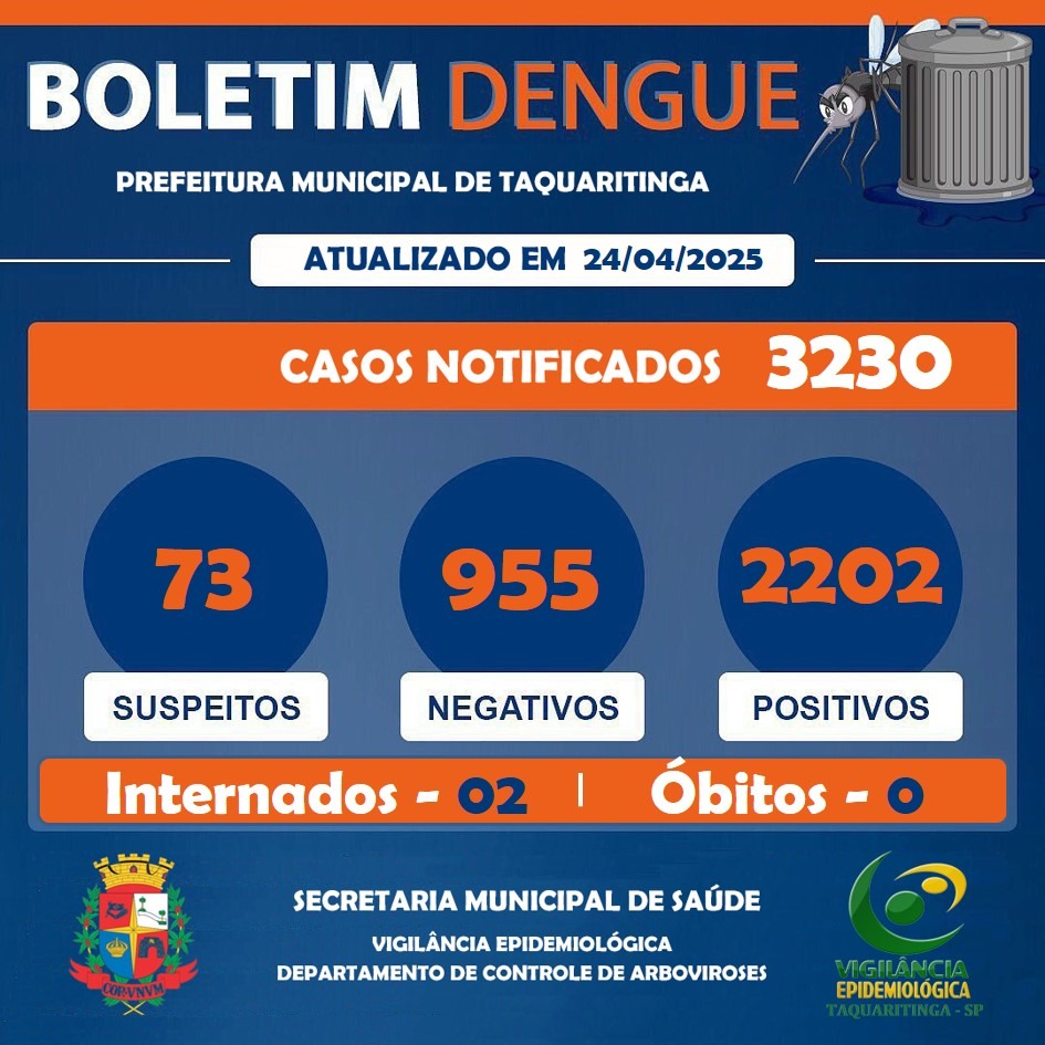O município de Taquaritinga vive um cenário preocupante em relação à dengue. De acordo com o boletim epidemiológico divulgado pela Prefeitura Municipal nesta quinta-feira, 24 de abril de 2025, a cidade já acumula 3.230 casos notificados, sendo 2.202 confirmados como positivos para a doença. O número coloca a cidade em estado de alerta e exige atenção redobrada da população e das autoridades de saúde.