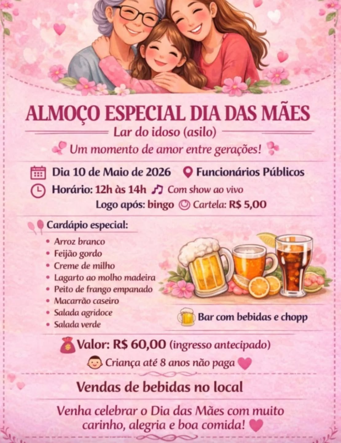 De acordo com a organização, o convite é voltado a toda a população e busca incentivar a participação em um momento de amor, gratidão e integração entre gerações. O valor do ingresso antecipado é de R$ 60,00, enquanto crianças de até 8 anos não pagam. Além disso, haverá venda de bebidas no local, incluindo opções de bar e chopp.