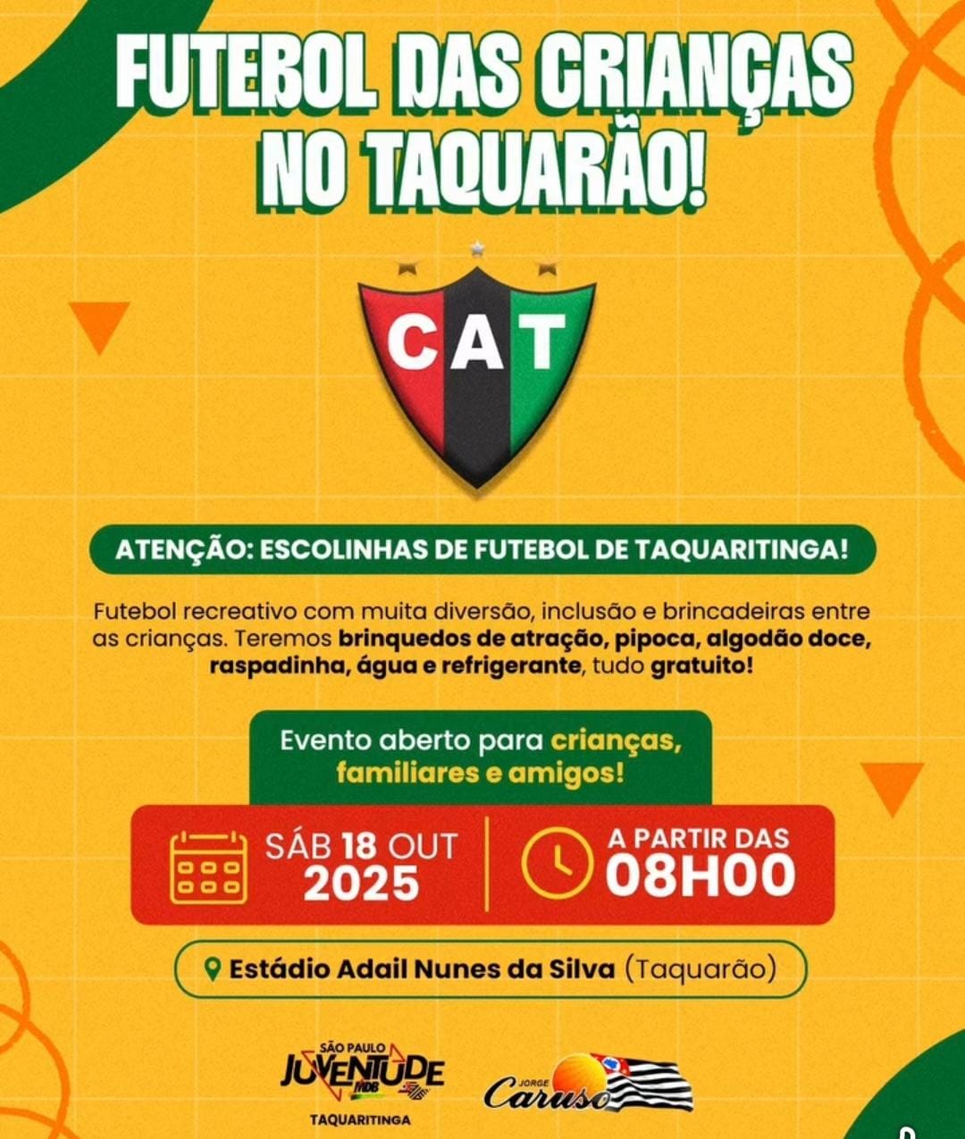 O Clube Atlético Taquaritinga (CAT) promove, no próximo dia 18 de outubro, a partir das 8h, mais uma edição do Futebol das Crianças, evento voltado à comunidade e às famílias taquaritinguenses. A programação será realizada no Estádio Adail Nunes da Silva (Taquarão) e promete uma manhã de esporte, confraternização e diversão, com diversas atividades gratuitas destinadas especialmente ao público infantil.