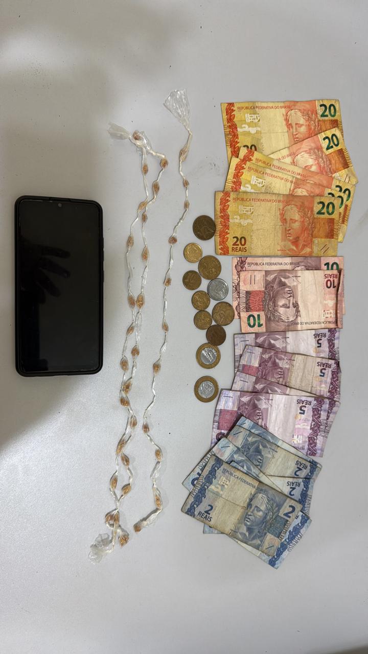 Durante a revista pessoal, foram encontrados em seus bolsos um celular, R$ 32,00 em cédulas e R$ 3,70 em moedas. No interior da bolsa, os policiais localizaram uma carteira com mais R$ 120,00 e 34 pedras de crack embaladas individualmente em plástico transparente — padrão comum para distribuição fracionada de entorpecentes.