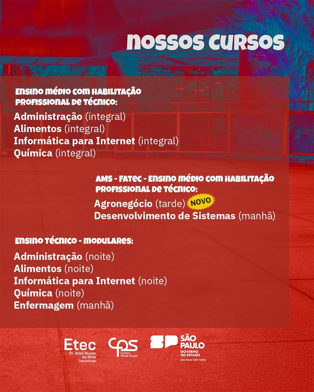 No formato modular, voltado para quem já concluiu o ensino médio, a escola disponibiliza os cursos de Administração, Alimentos, Informática para Internet e Química, todos no período noturno, além do curso de Enfermagem, oferecido no período da manhã. Essa modalidade é ideal para quem deseja se especializar ou buscar uma recolocação no mercado de trabalho.