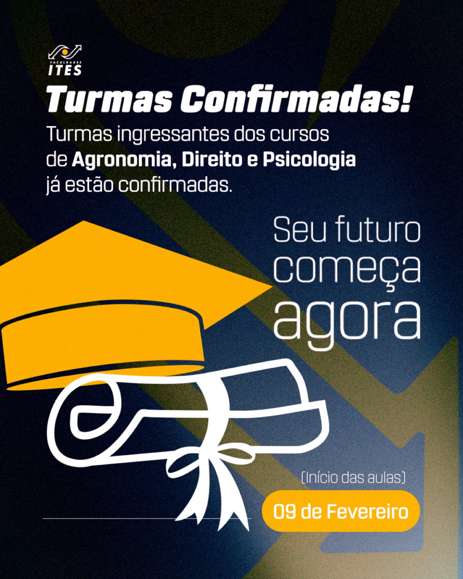 A instituição de ensino ITES confirmou a abertura de novas turmas ingressantes para os cursos de Agronomia, Direito e Psicologia, com início das aulas previsto para o dia 9 de fevereiro. O anúncio marca mais uma etapa do calendário acadêmico e reforça a ampliação da oferta de formação superior em áreas estratégicas para o desenvolvimento regional e profissional.