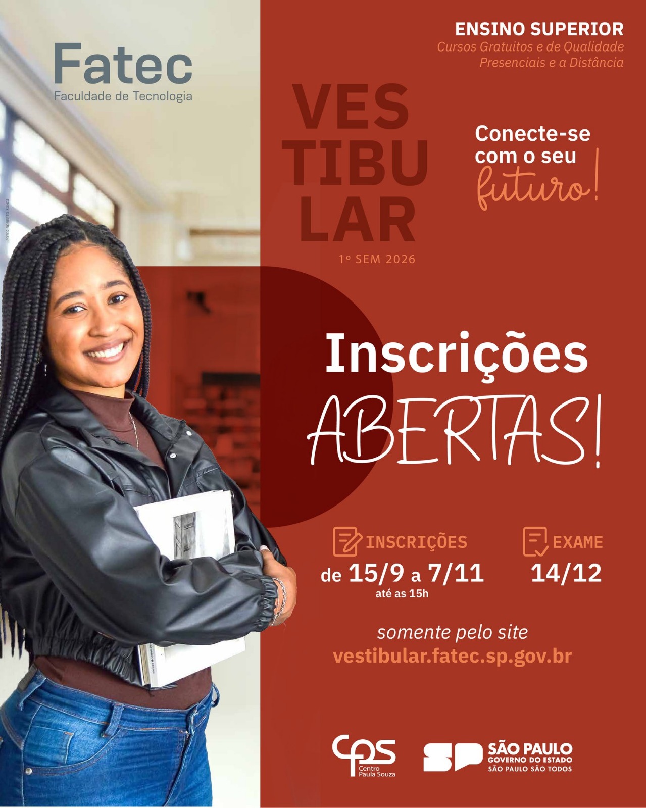 As Faculdades de Tecnologia do Estado de São Paulo (Fatecs), abriram as inscrições para o vestibular do 1º semestre de 2026, oferecendo a oportunidade para milhares de estudantes conquistarem uma vaga em cursos superiores gratuitos e de qualidade. O prazo de inscrição segue até o dia 7 de novembro, às 15h, exclusivamente pelo site oficial vestibular.fatec.sp.gov.br.