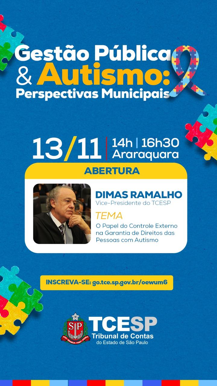Segundo a organização, a iniciativa busca fortalecer o conhecimento técnico e prático de gestores e servidores públicos, oferecendo subsídios para a criação de programas mais eficazes de atendimento e inclusão de pessoas com TEA. Dr. Dimas Ramalho, promoverá a abertura do evento, falando a respeito do “papel do controle externo na garantia de direitos das pessoas com autismo”.