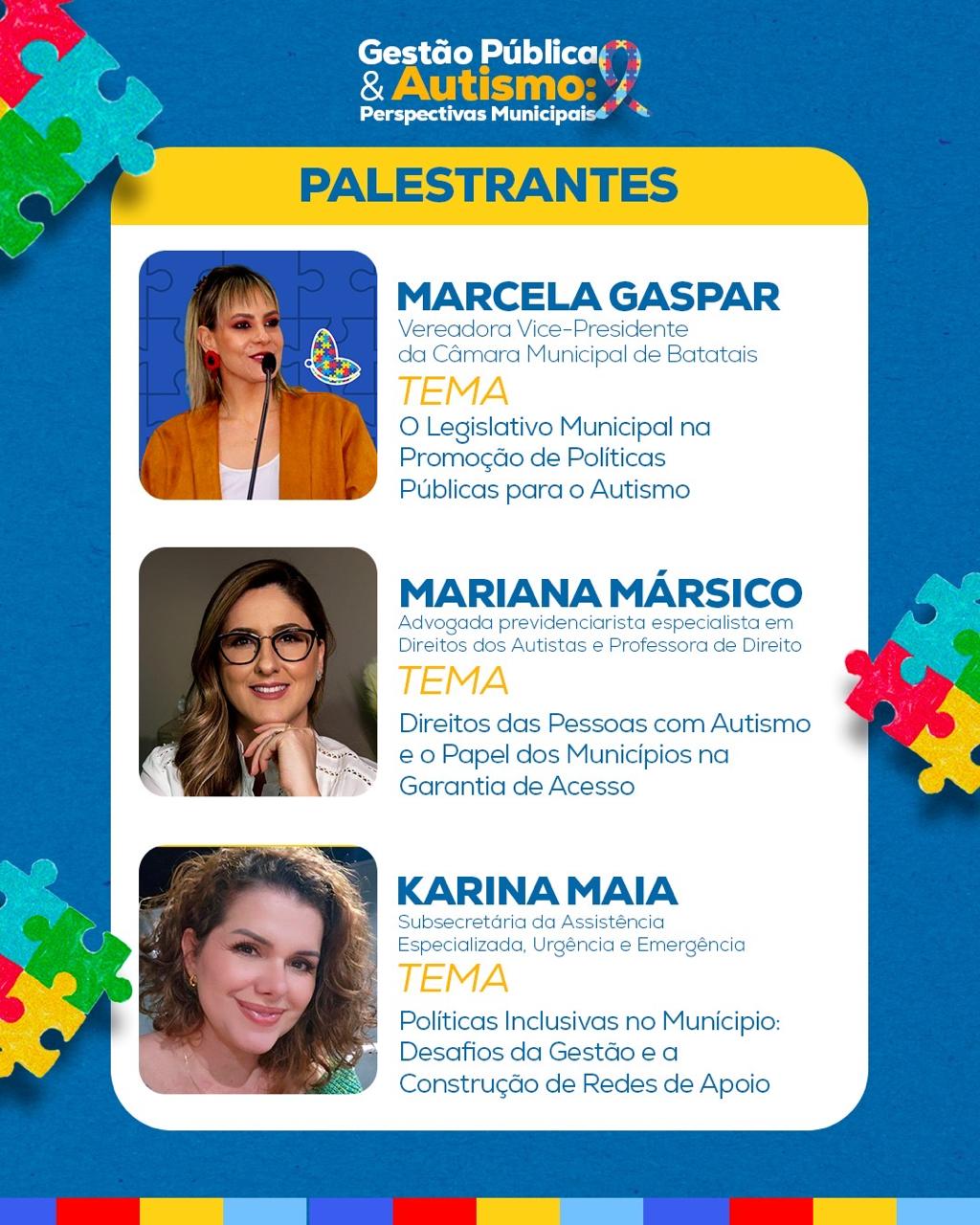 O encontro reunirá especialistas, gestores e representantes do poder público para discutir os desafios e avanços na inclusão social, na educação e na saúde de pessoas com autismo no contexto municipal. A programação contará com a presença do vice-presidente do TCESP, Dr. Dimas Ramalho, do Deputado Federal Fernando, da Vereadora Marcella Gaspar (Batatais), da advogada Mariana Mársico, especialista em Direitos dos Autistas, e da Subsecretária de Assistência Especializada Karina Maia, referência nacional em Gestão Pública e Autismo.