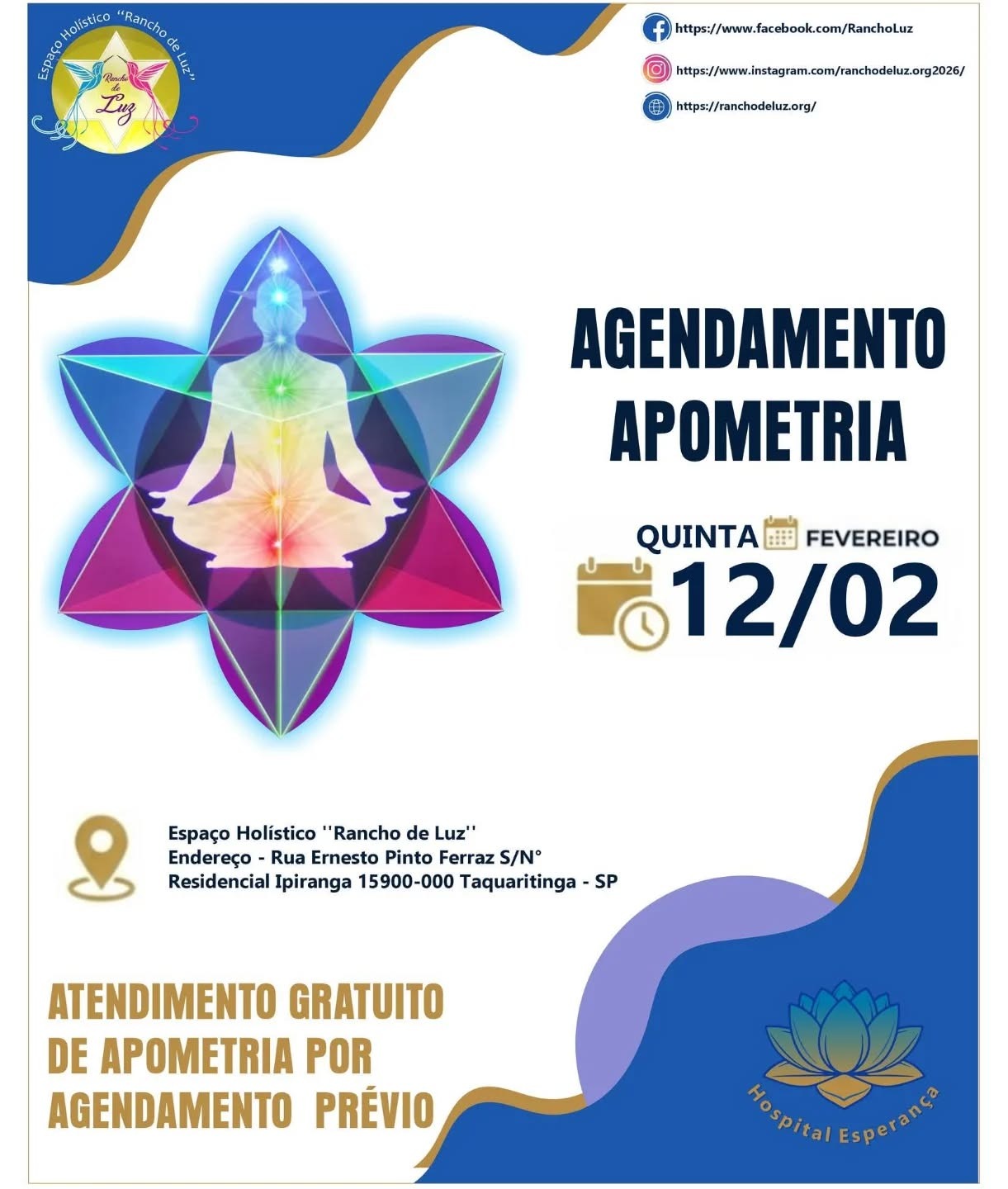 O Espaço Holístico Rancho de Luz, localizado no distrito de Talavasso, em Taquaritinga, abriu uma nova rodada de atendimentos gratuitos de Apometria para o dia 12 de fevereiro de 2026. As sessões, bastante procuradas por pessoas interessadas em terapias integrativas, serão oferecidas somente mediante agendamento prévio, realizado exclusivamente pelo link disponibilizado pela instituição. A organização reforça que cada participante deve efetuar apenas um agendamento, evitando duplicidade de inscrições.