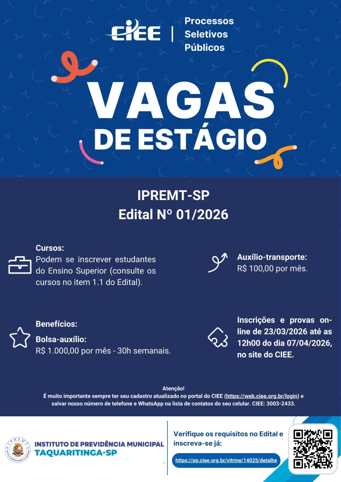 O Instituto de Previdência Municipal de Taquaritinga (IPREMT-SP) abriu inscrições para o processo seletivo de estágio, conforme o Edital nº 01/2026, oferecendo oportunidade para estudantes do ensino superior interessados em ingressar no serviço público. A seleção é realizada em parceria com o CIEE (Centro de Integração Empresa-Escola) e prevê benefícios financeiros e carga horária compatível com a formação acadêmica.