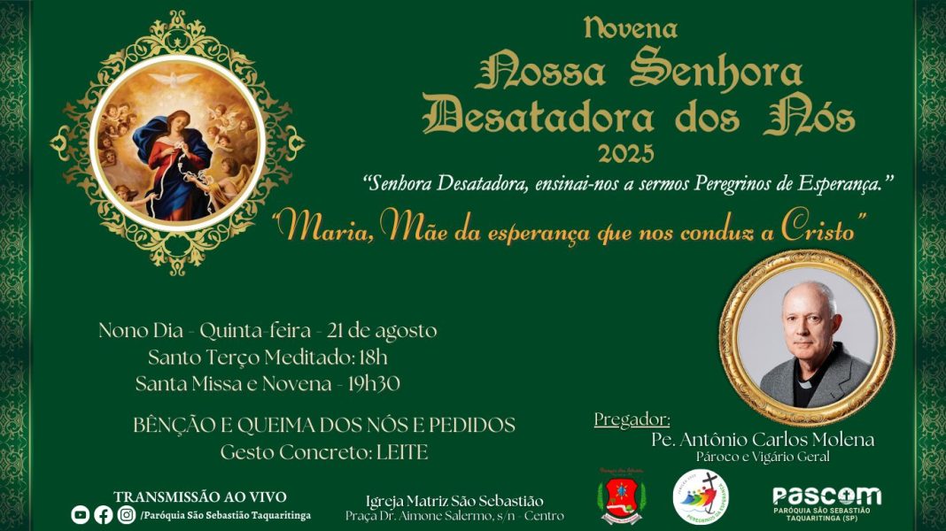 A Paróquia São Sebastião de Taquaritinga realiza nesta quinta-feira, 21 de agosto, o nono dia da Novena de Nossa Senhora Desatadora dos Nós 2025, reunindo fiéis em um momento de oração, fé e esperança. A celebração, que já se consolidou como uma das mais aguardadas manifestações religiosas da cidade, traz como tema central “Maria, Mãe da esperança que nos conduz a Cristo”, reforçando a devoção à Virgem Maria e a busca pela renovação espiritual.