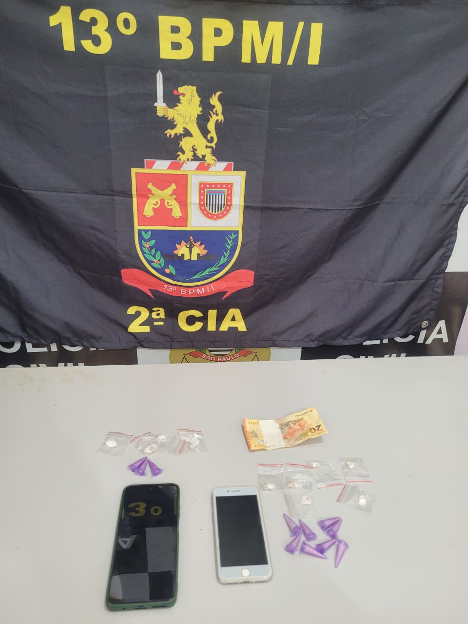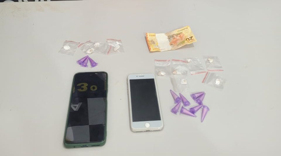 Com o primeiro suspeito, os policiais localizaram oito eppendorfs com cocaína (0,010 kg), seis invólucros plásticos contendo pedras de crack (0,005 kg), uma cédula de R$ 20,00 e um aparelho celular da marca iPhone. Já com o segundo indivíduo, foram apreendidos três eppendorfs com cocaína (0,005 kg), quatro invólucros plásticos com crack (0,001 kg) e um celular da marca Motorola.