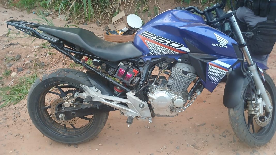 No ponto informado, os agentes localizaram uma motocicleta Honda CB 250F Twister, de cor azul, sem placa de identificação e com número de chassi e motor suprimidos, o que caracteriza forte indício de irregularidade. Um dado relevante, segundo o boletim, é que o motor ainda estava quente no momento da localização, sugerindo que o veículo havia sido utilizado recentemente ou abandonado pouco tempo antes da chegada da polícia.