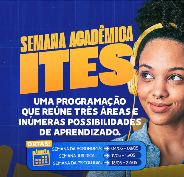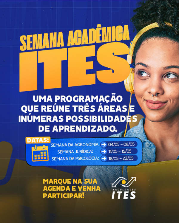 O ITES divulgou a realização da Semana Acadêmica ITES, evento institucional programado para o mês de maio e voltado ao fortalecimento da formação universitária. A iniciativa contempla três áreas distintas do ensino superior: Agronomia, Jurídica e Psicologia, com atividades distribuídas ao longo do mês. A proposta é promover atualização de conteúdos, troca de experiências e aproximação dos estudantes com o mercado de trabalho.