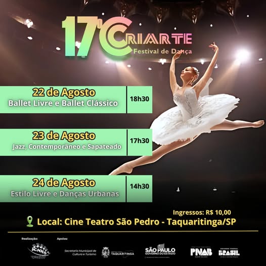 Entre os dias 22 e 24 de agosto, Taquaritinga é palco de um dos maiores eventos culturais da região: o 17º Criarte Festival de Dança, realizado no Cine Teatro São Pedro. A iniciativa reuni grupos de 42 cidades, trazendo ao público um espetáculo diversificado, que valorizou tanto os talentos locais quanto artistas de renome no cenário da dança.