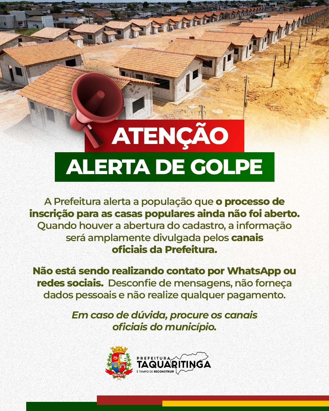 A Prefeitura de Taquaritinga emitiu um alerta oficial à população sobre tentativas de golpe relacionadas a supostos programas de casas populares que ainda não foram abertos pelo município. De acordo com a administração municipal, circulam mensagens por WhatsApp e redes sociais informando, de forma fraudulenta, que moradores teriam sido contemplados com imóveis que sequer tiveram o processo de inscrição iniciado.