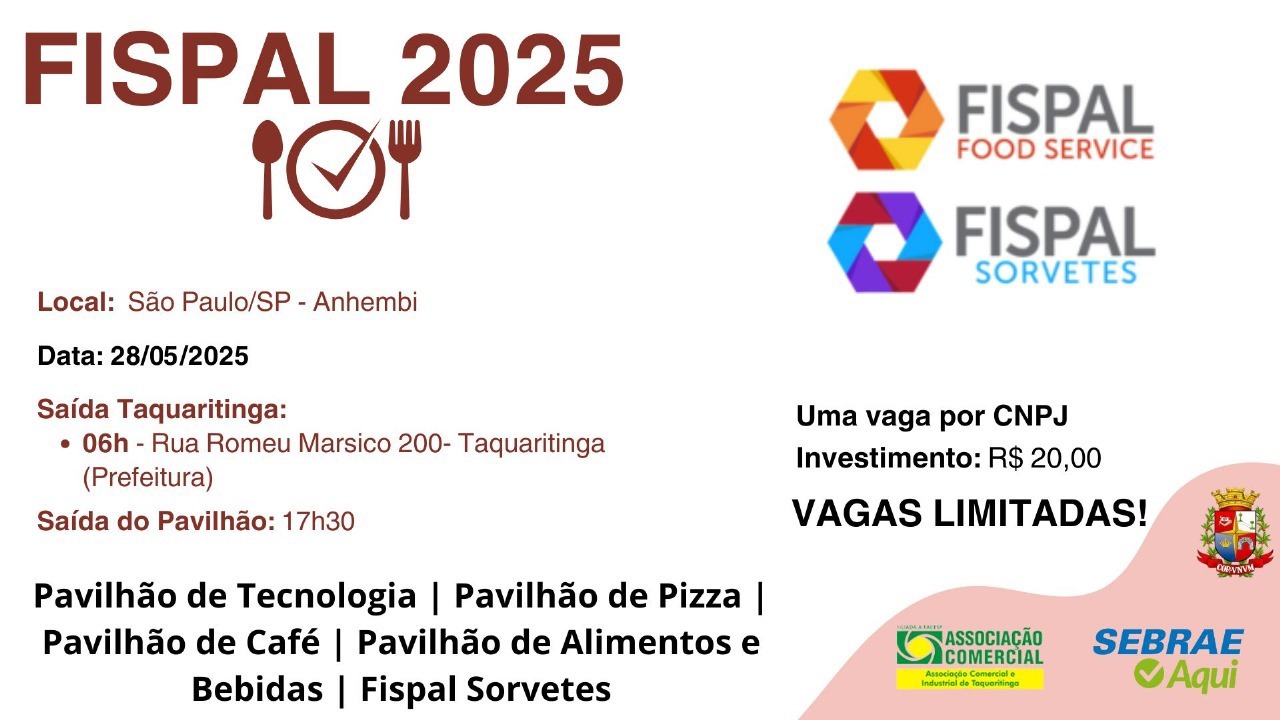 No próximo dia 28 de maio, Taquaritinga marcará presença em um dos eventos mais relevantes do setor de alimentação fora do lar: a Fispal Food Service 2025, realizada no Anhembi, em São Paulo. Por meio de uma Missão Empresarial organizada pelo Sebrae Aqui, com apoio da Prefeitura, empresários e profissionais locais terão a oportunidade de vivenciar um dia de imersão no maior evento da América do Sul dedicado ao food service.