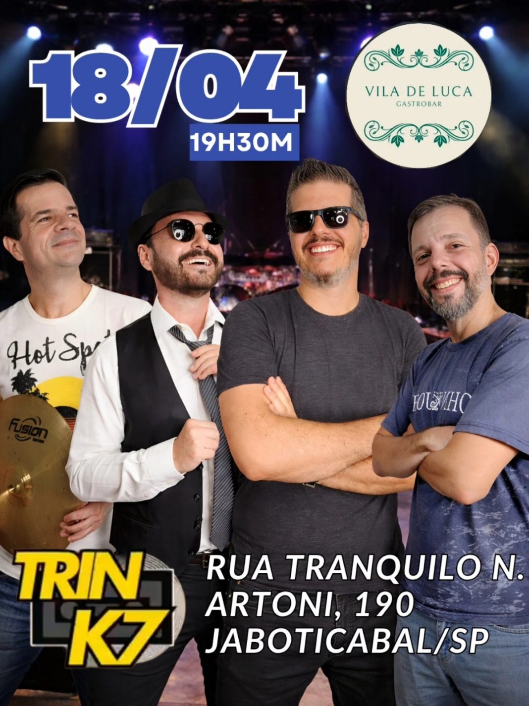 A cidade de Jaboticabal recebe neste sábado, 18 de abril, a apresentação da banda Trink7, que promete levar ao público uma noite de música ao vivo e entretenimento. O show está marcado para as 19h30, no Vila De Luca Gastrobar, localizado na Rua Tranquilo N. Artoni, 190.
