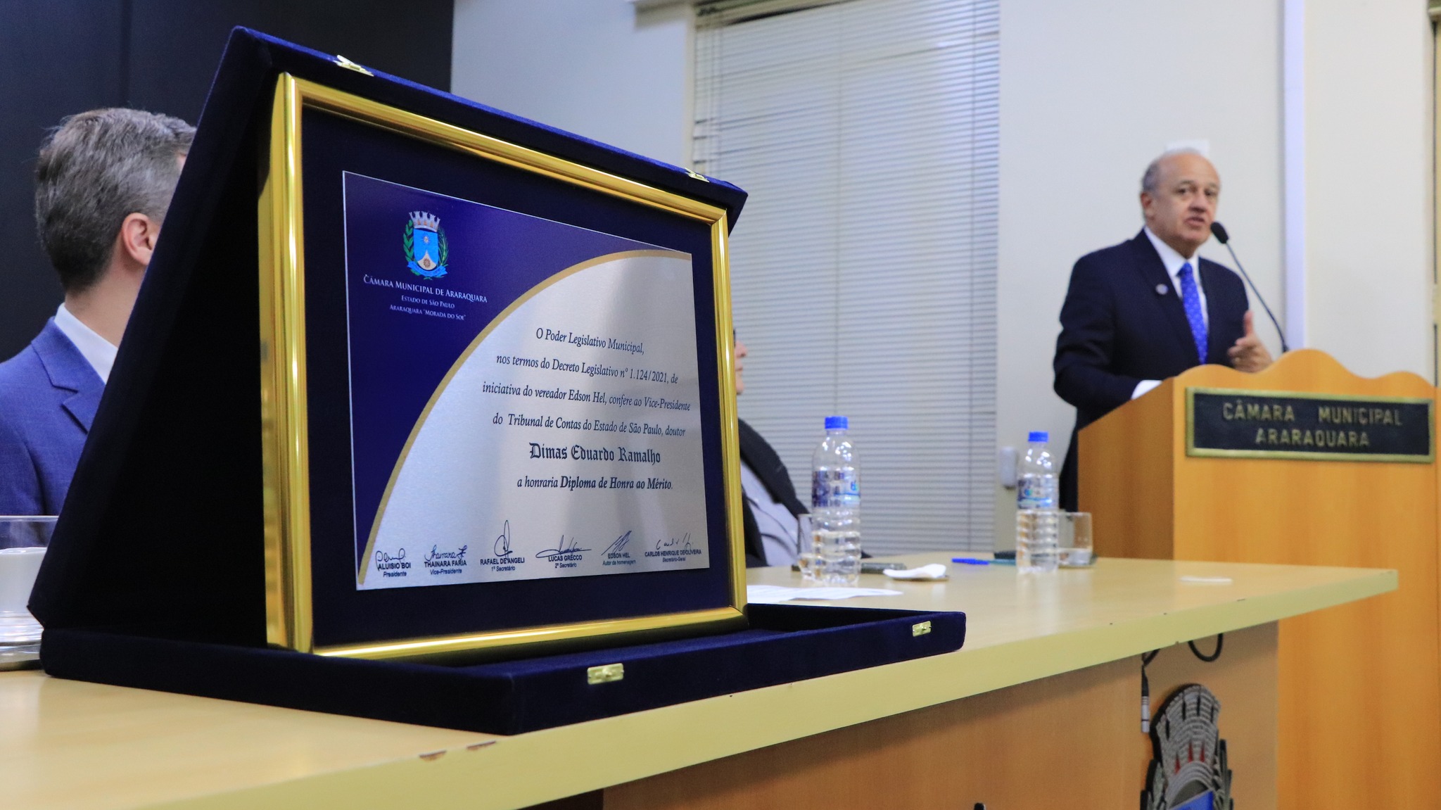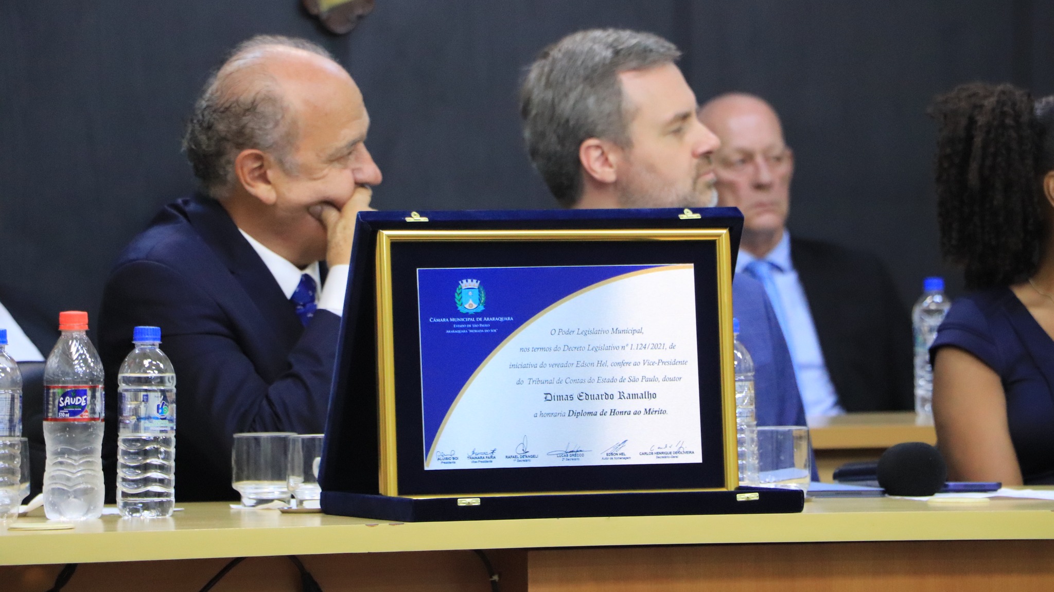 O vice-presidente do Tribunal de Contas do Estado de São Paulo (TCESP), Dimas Eduardo Ramalho, recebeu na noite desta sexta-feira (5) o Diploma de Honra ao Mérito durante sessão solene realizada no Plenário da Câmara Municipal de Araraquara. A honraria, concedida por iniciativa do ex-vereador Edson Hel, da legislatura 2021-2024, reuniu dezenas de autoridades e representantes da região, que lotaram o espaço para acompanhar a cerimônia.