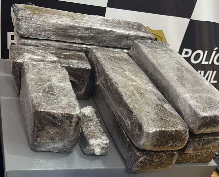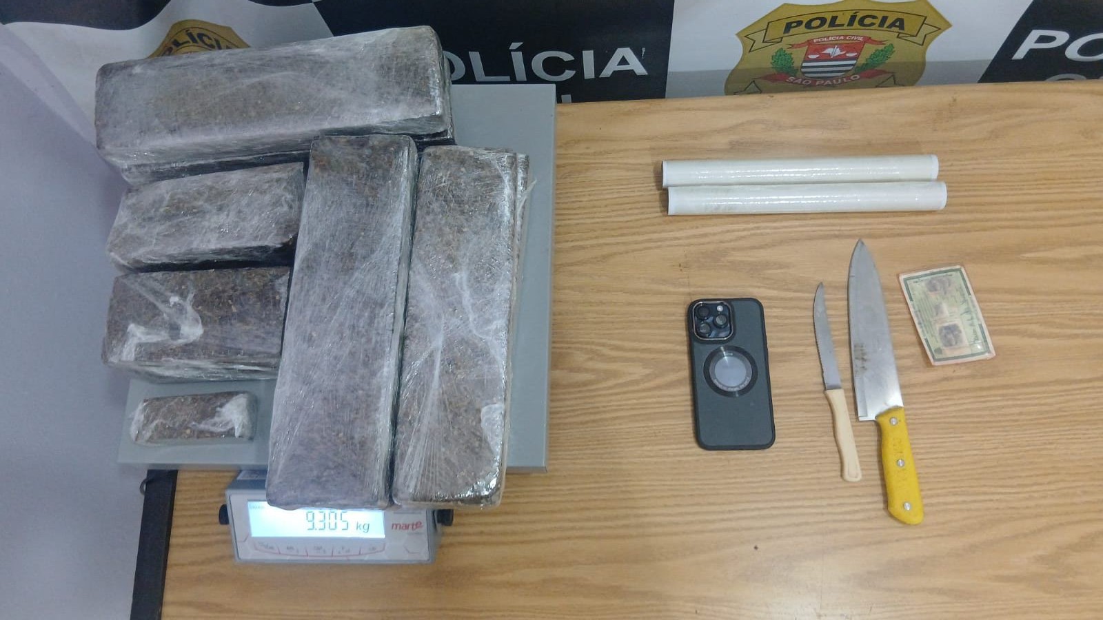 No total, foram apreendidos 9,400 kg de maconha, duas facas com resquícios do entorpecente, dois rolos de papel filme e um aparelho celular da marca iPhone. Diante das evidências, foi dada voz de prisão ao suspeito, identificado como Wesley, sendo informado sobre seus direitos constitucionais. O uso de algemas foi necessário devido à tentativa de fuga, conforme previsto na legislação vigente.