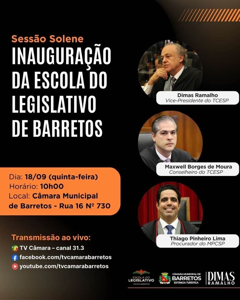 A Câmara Municipal de Barretos realiza, nesta quinta-feira, dia 18 de setembro, a sessão solene de inauguração da Escola do Legislativo de Barretos. O evento acontecerá às 10h, no plenário da Casa de Leis, localizada na Rua 16, nº 730.