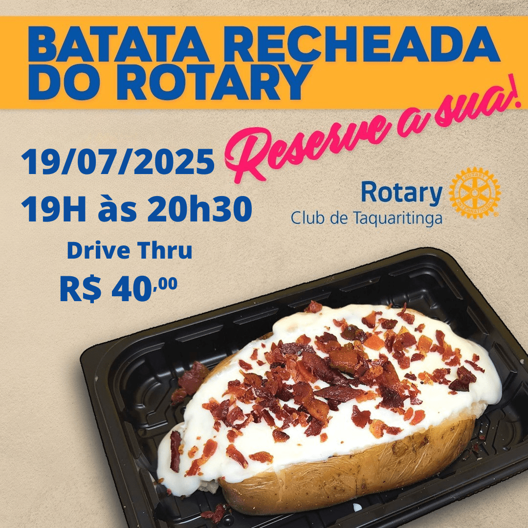 No próximo sábado, 19 de julho, o Rotary Club de Taquaritinga convida a comunidade para mais uma edição do seu tradicional evento gastronômico: a Batata Recheada Solidária. A ação, que já se tornou um marco de sabor e solidariedade na cidade, será realizada em formato drive-thru, das 19h às 20h30, garantindo praticidade, conforto e segurança aos participantes.