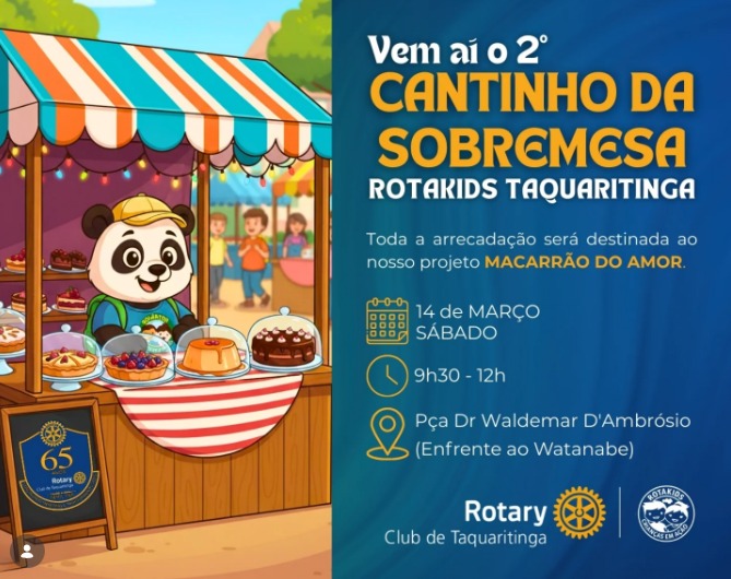 O Rotakids de Taquaritinga realizará, no próximo dia 14 de março, uma ação solidária voltada à arrecadação de recursos para o projeto social “Macarrão do Amor”. A iniciativa ocorrerá na Praça Dr. Waldemar D’Ambrósio, localizada em frente ao tradicional ponto comercial Watanabe, e contará com a venda de sobremesas preparadas pelos integrantes do grupo. O atendimento ao público está previsto para ocorrer das 9h30 às 12h, ou enquanto durarem os produtos disponíveis.