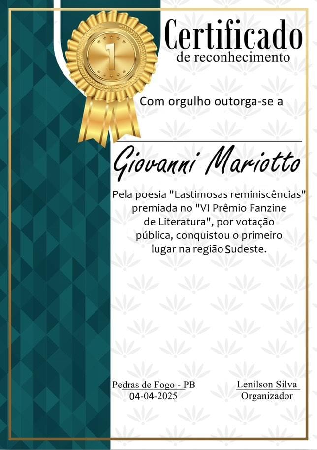 A literatura brasileira acaba de ganhar mais um nome de destaque. O poeta Giovanni Mariotto, natural de Taquaritinga (SP), foi o grande vencedor do VI Prêmio Fanzine de Literatura, promovido anualmente pelo produtor cultural Lenilson Silva, da cidade de Pedras de Fogo, na Paraíba. A premiação, que tem ganhado força e visibilidade nas redes sociais, busca valorizar autores independentes de todas as regiões do país — e, este ano, consagrou Giovanni como o representante da Região Sudeste, levando o primeiro lugar com mais de 26% dos votos.