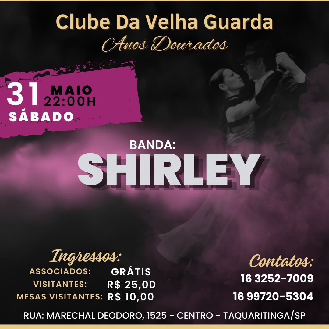 Neste sábado, 31 de maio, o Clube da Velha Guarda de Taquaritinga promove mais uma noite repleta de música e animação. A partir das 22h, o público poderá prestigiar o show da consagrada Banda Shirley, que promete embalar a pista com repertório envolvente e dançante.