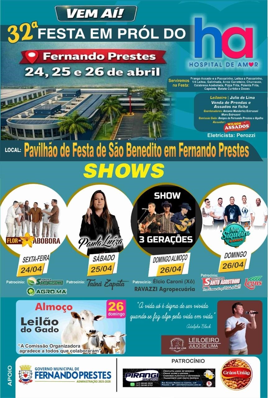 O município de Fernando Prestes se prepara para sediar, entre os dias 24 e 26 de abril, a 32ª Festa em Prol do Hospital de Amor, uma das mais tradicionais ações beneficentes da região. O evento será realizado no Pavilhão de Festas de São Benedito e tem como objetivo arrecadar recursos para a instituição de Barretos, reconhecida nacionalmente pelo atendimento gratuito a pacientes com câncer.