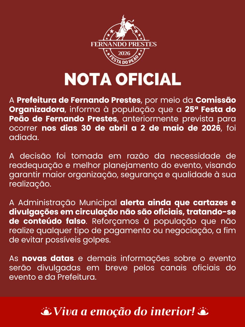 A Prefeitura de Fernando Prestes não informou uma nova data para a realização da festa, mas garantiu que a definição será comunicada em breve. Até lá, a administração pede cautela à população e reforça o compromisso com a transparência e a segurança dos participantes.
