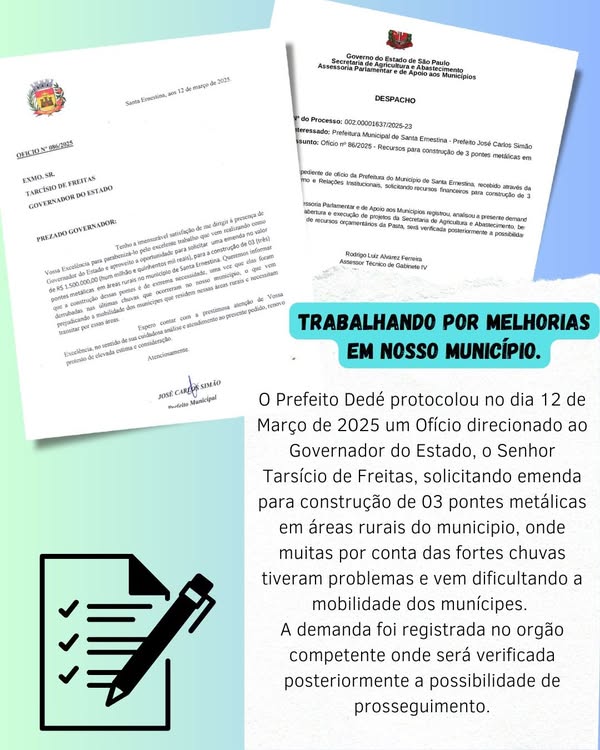 O Prefeito de Santa Ernestina, Dedé, formalizou no dia 12 de março de 2025 um ofício ao Governador do Estado de São Paulo, Tarcísio de Freitas, solicitando a liberação de recursos para a construção de três pontes metálicas em áreas rurais do município. A medida visa solucionar problemas estruturais agravados pelas fortes chuvas dos últimos meses, que comprometeram as pontes existentes e dificultaram a mobilidade da população.