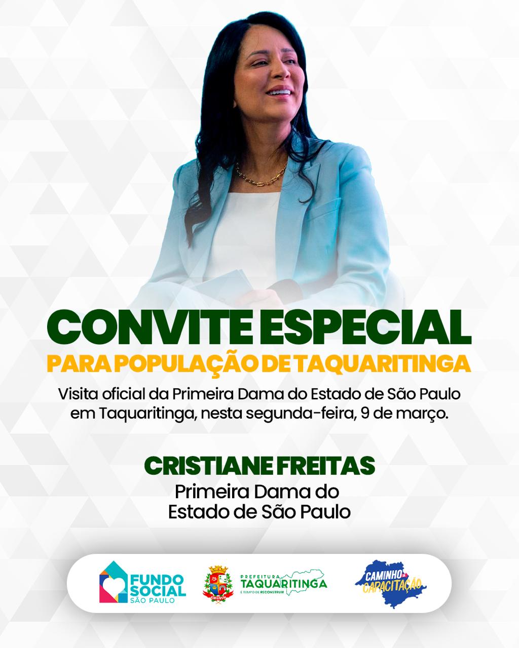 O município de Taquaritinga receberá, nesta segunda-feira (9), a visita oficial da primeira-dama do Estado de São Paulo e presidente do Fundo Social de Solidariedade, Cristiane Freitas. A agenda institucional prevê um encontro com a população às 14h50, na Praça Dr. Waldemar D’Ambrósio, no centro da cidade, onde será realizada a visita à carreta de capacitação profissional, iniciativa voltada à oferta de cursos gratuitos com certificação.