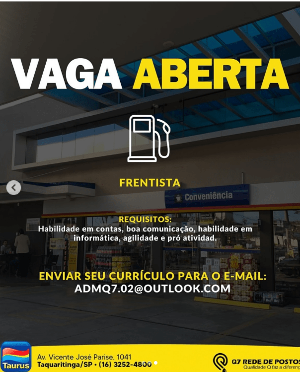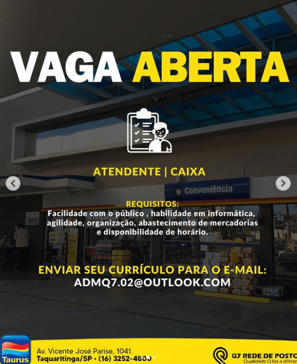 Empresa oferece oportunidades para frentista e atendente de caixa no Posto Taurus; currículos devem ser enviados por e-mail