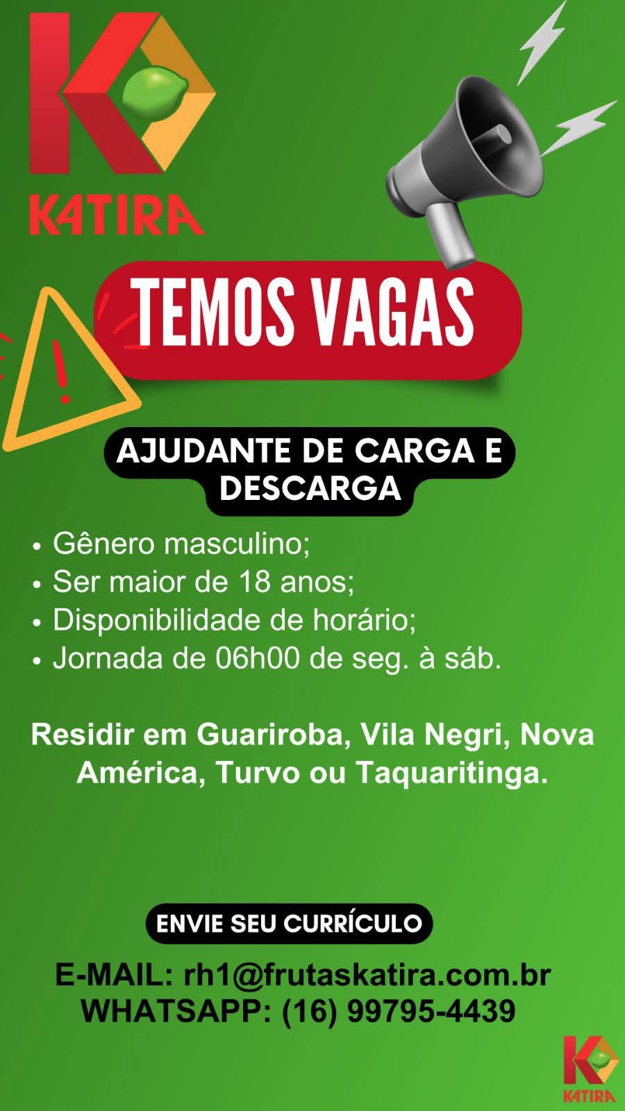 A Frutas Katira, empresa de destaque no ramo agrícola, está com processo seletivo aberto para a função de ajudante de carga e descarga. A oportunidade é destinada a homens maiores de 18 anos, com disponibilidade de horário e residência em Guariroba, Vila Negri, Nova América, Turvo ou Taquaritinga.