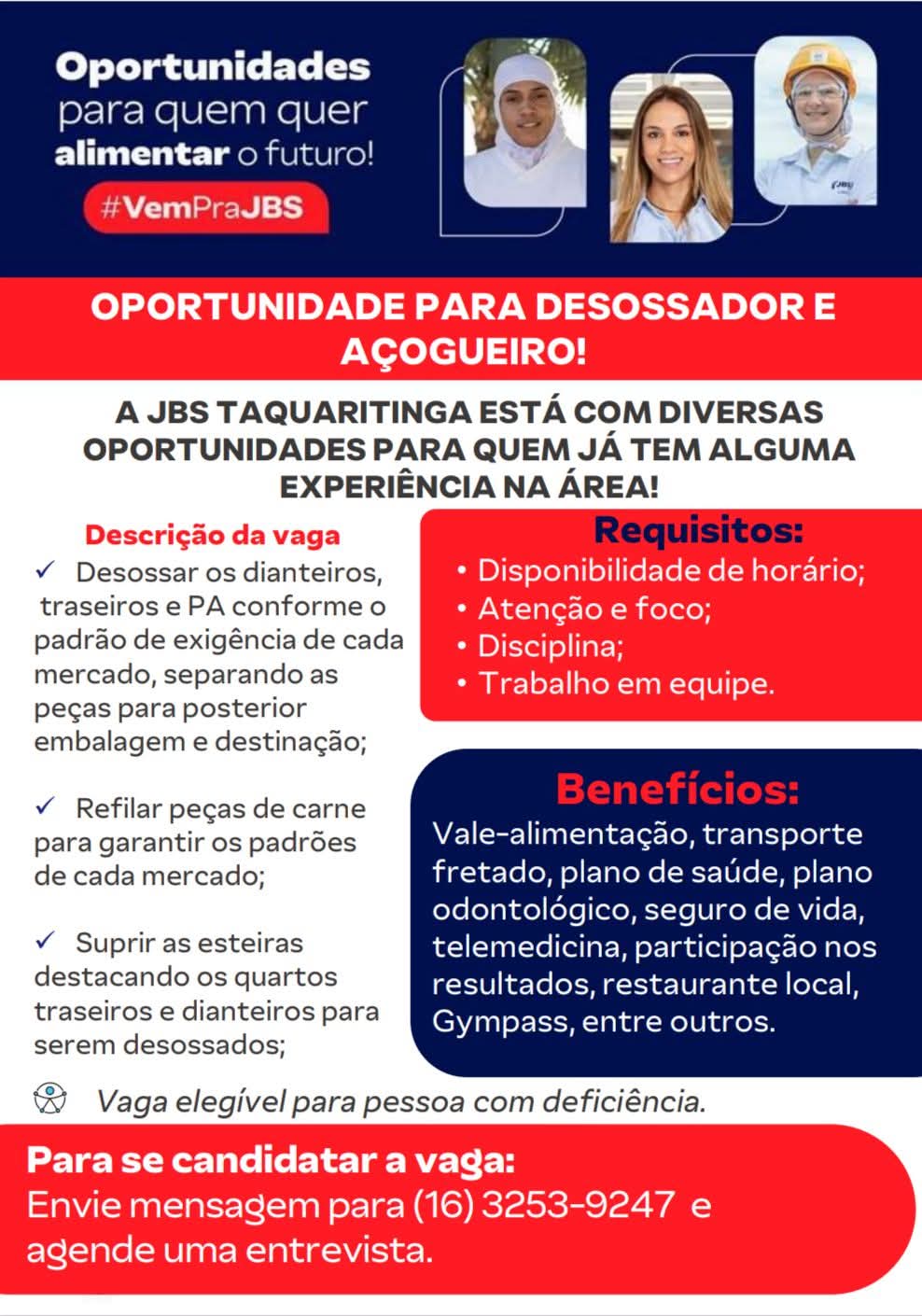 A JBS Taquaritinga anunciou a abertura de novas vagas de emprego para os cargos de desossador e açougueiro, direcionadas a profissionais que já possuam experiência no setor frigorífico ou no segmento de carnes. A iniciativa amplia as oportunidades formais de trabalho no município e reforça a demanda por mão de obra qualificada em uma das áreas industriais mais relevantes da economia regional.